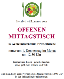 Atempause im Alltag Offene Kirche mit Mittagsgebet jeden 1. Donnerstag im Monat von 11 bis 12 Uhr. Anschl. Mittagessen im Gemeindehaus Nächster Termin: 05.02.2026